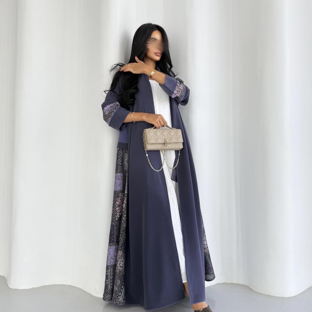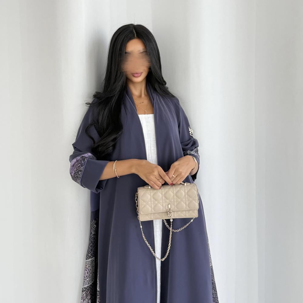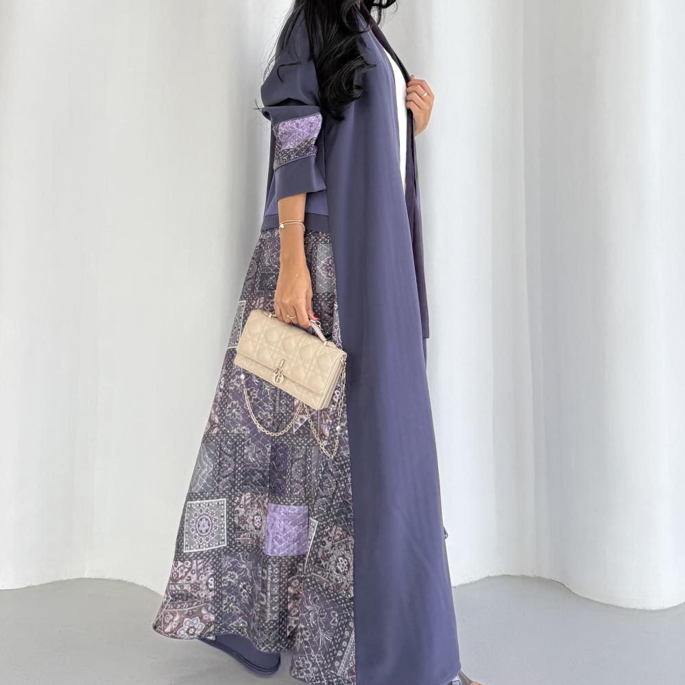 القماش: كريب سيراميك ساده بنفسجي مع لينن مطبوع وفيه ترتر شفاف مع تدخيله كريب بنفسجي فاتح
