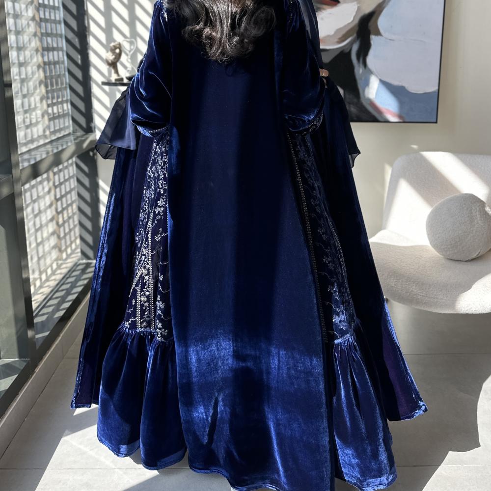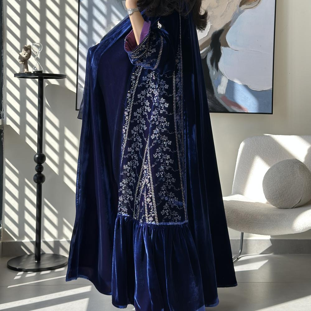 القماش: مخمل فرنسي كحلي مع مخمل فرنسي مطرز ببطانةالطرحة: كحليالقصة: نص كلوشطريقة الغسيل: غسيل جافدرجة التدفئة: وسط
