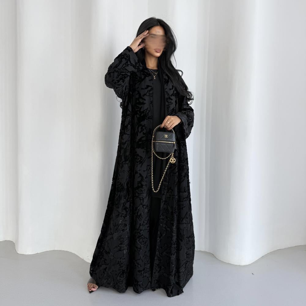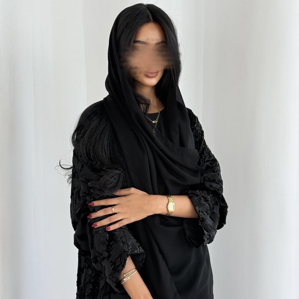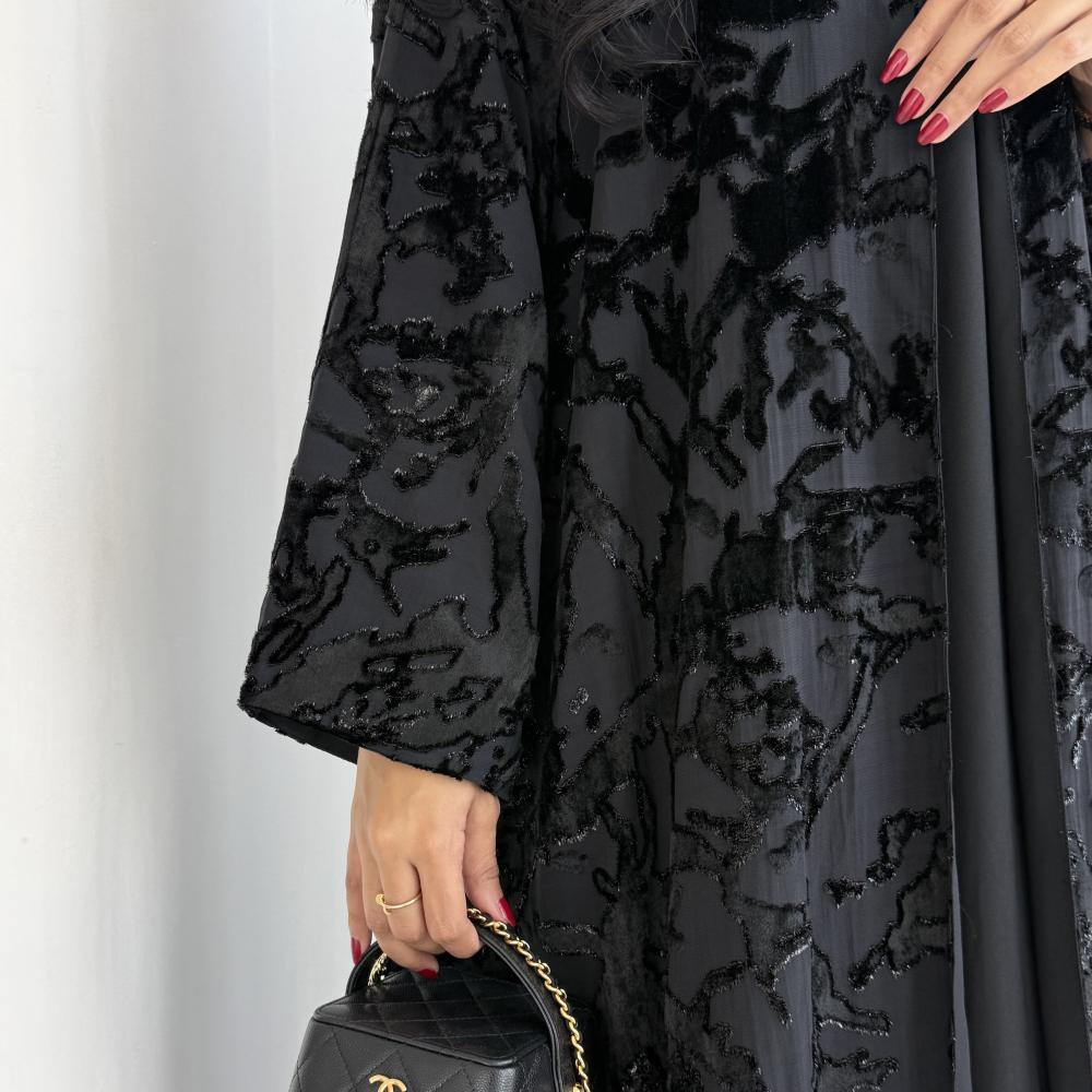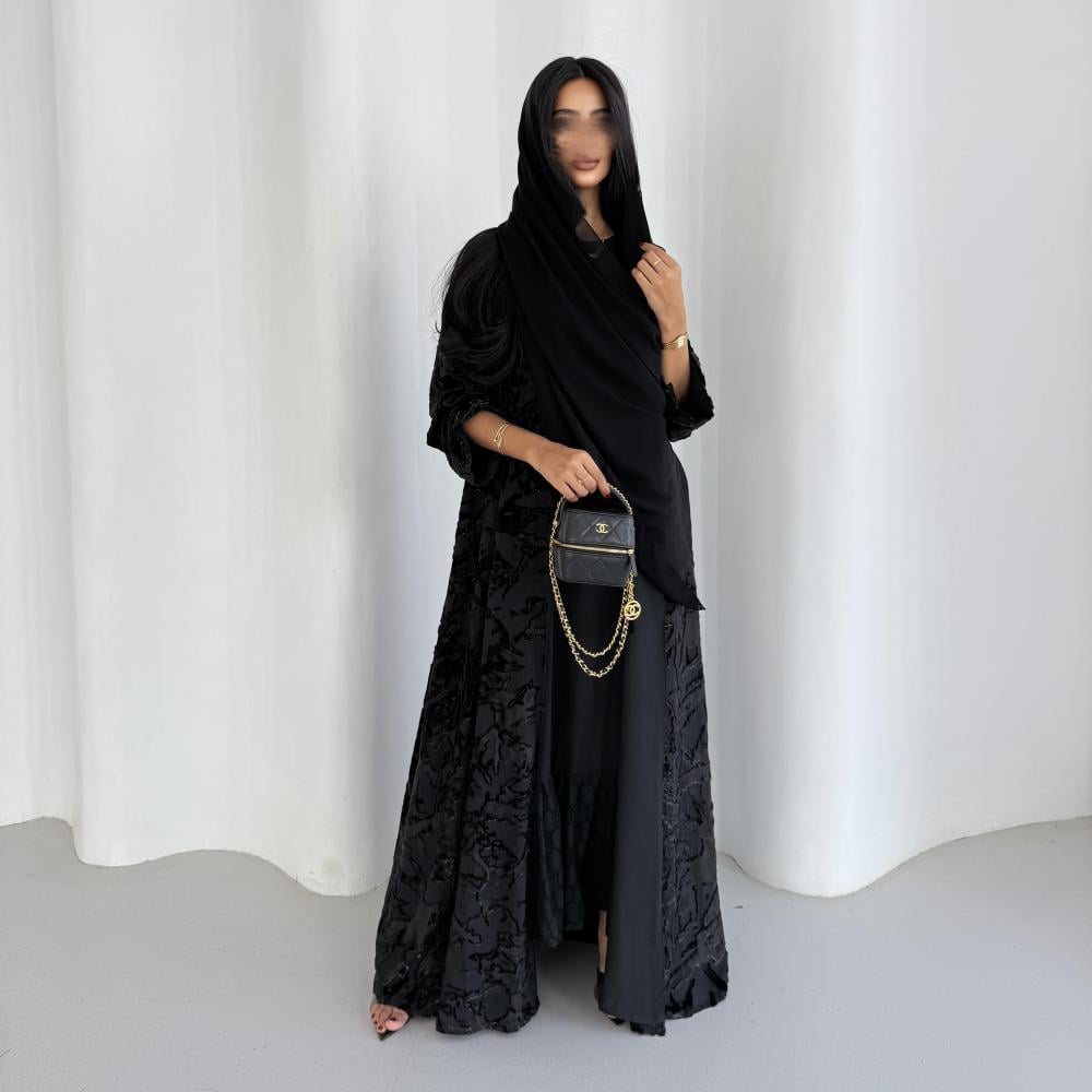 القماش: شيفون مخمل حرير اسود بلمعة اسود مبطن بشيفون اسود