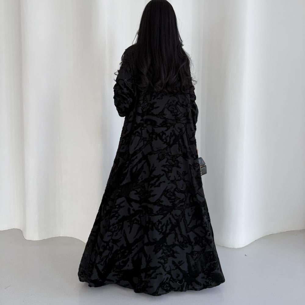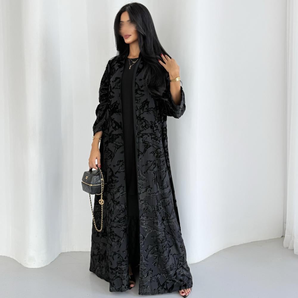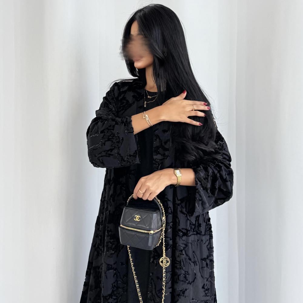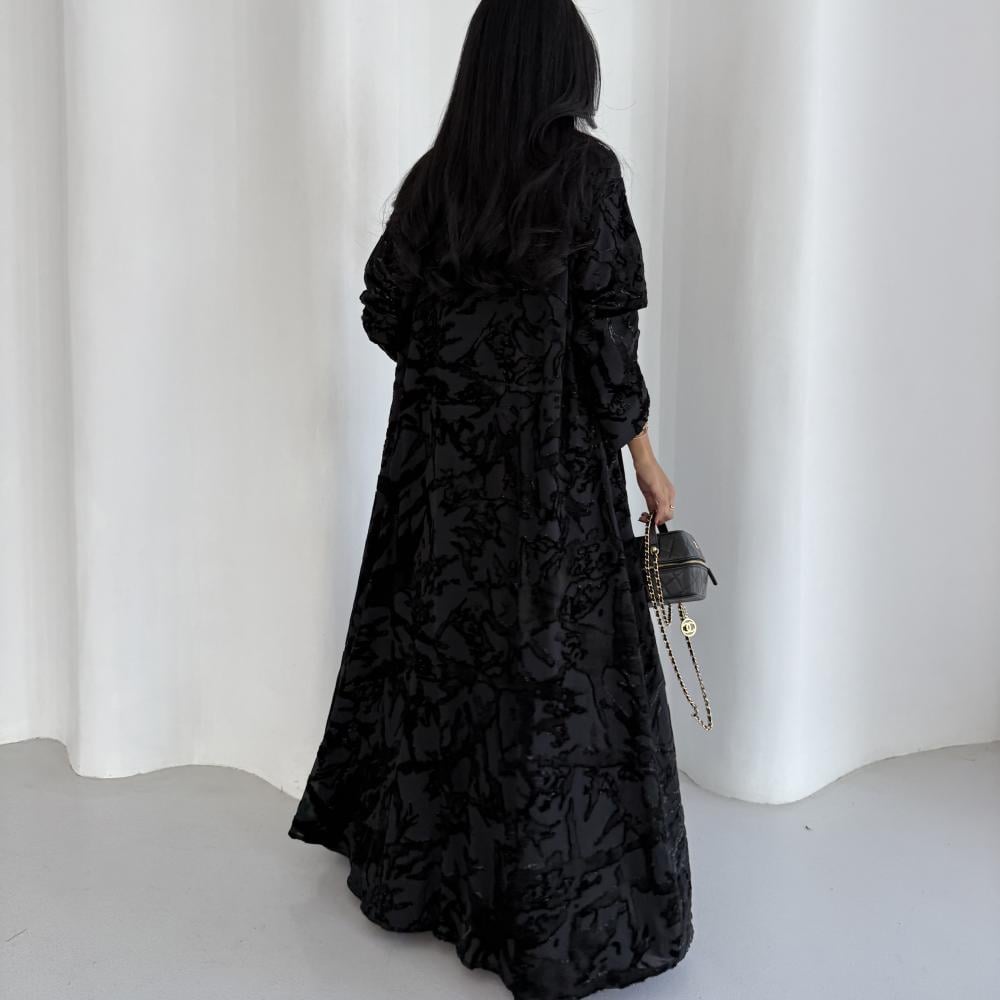 القماش: شيفون مخمل حرير اسود بلمعة اسود مبطن بشيفون اسود