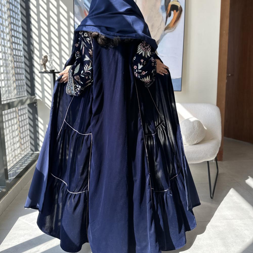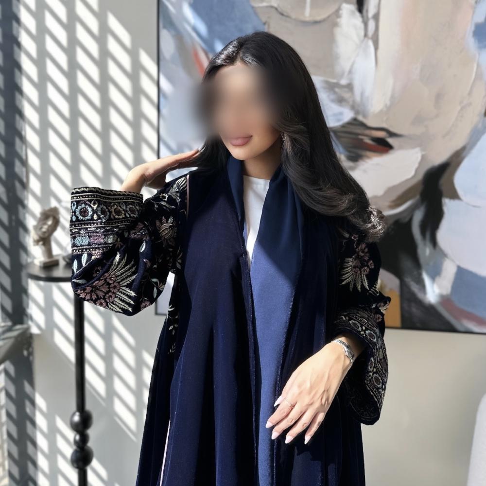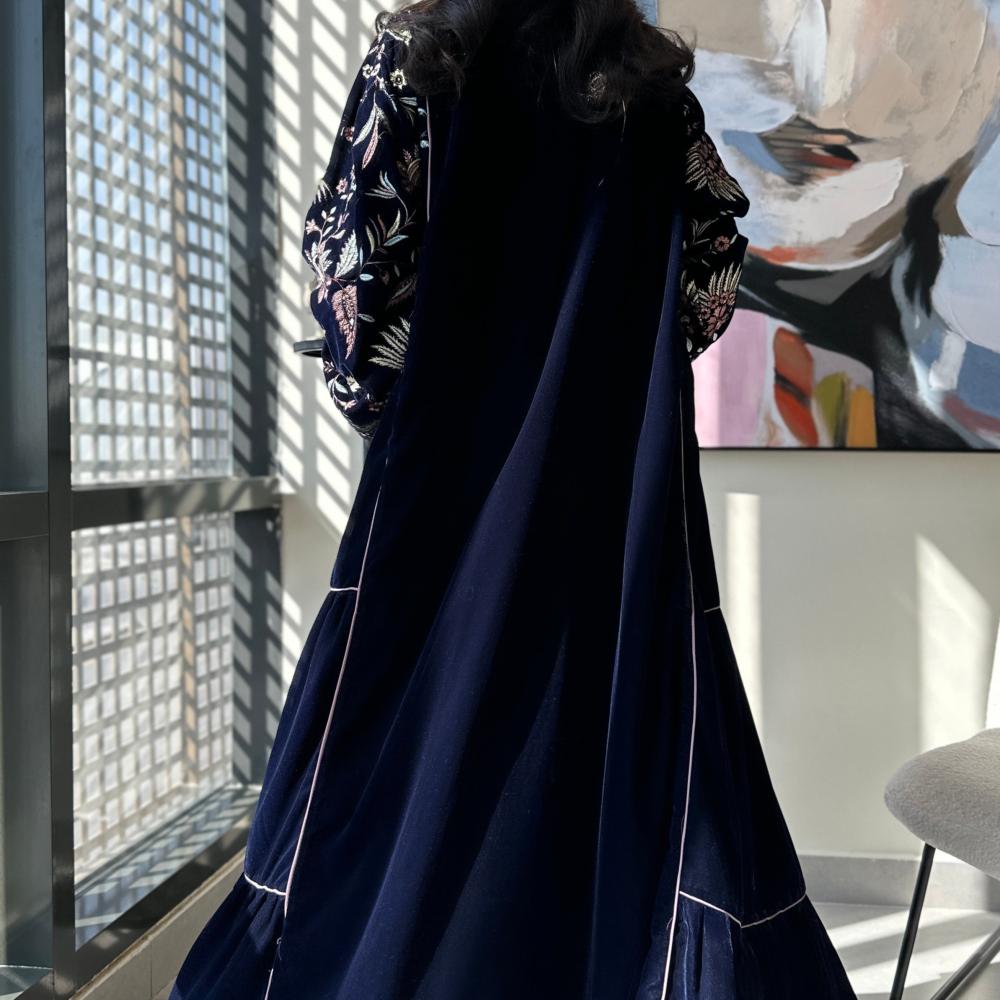 القماش: مخمل كوري كحلي مع مخمل مطرز هندي وكريستال وقيطان بينك