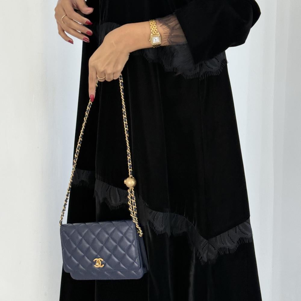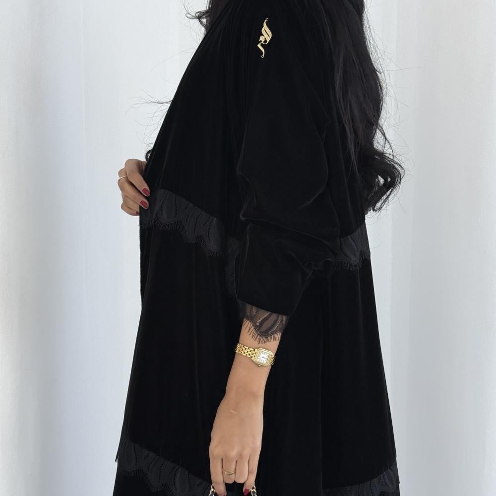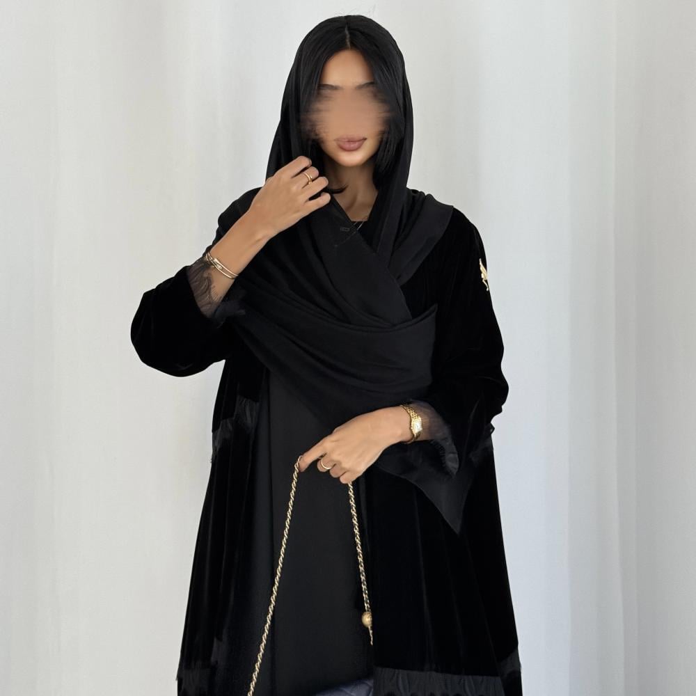 القماش: مخمل أسود مع كلفه دانتيل اسود مبطن بشيفون اسودالطرحة: اسودالقصة: نص كلوش طريقة الغسيل: غسيل جافدرجة التدفئة: خفيف