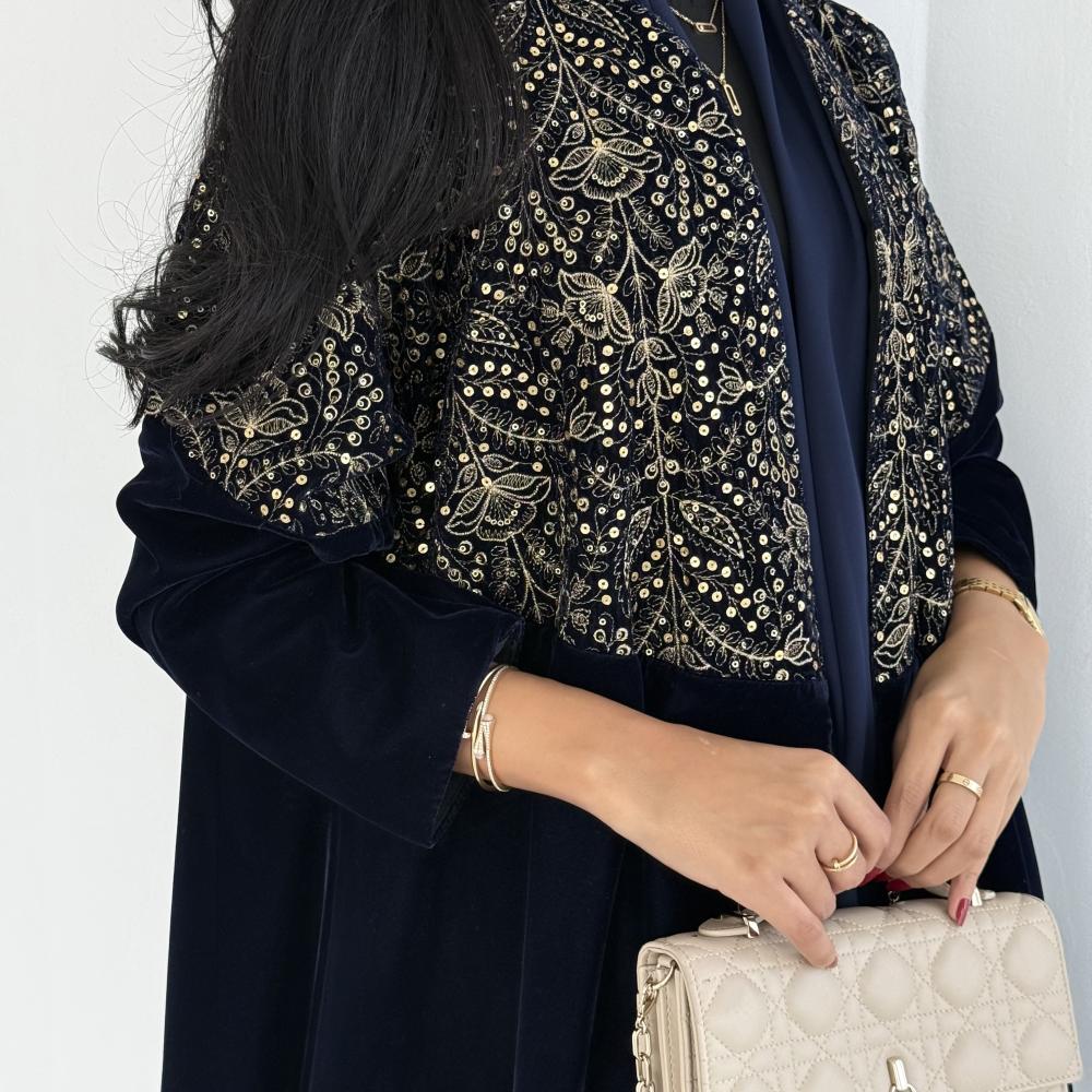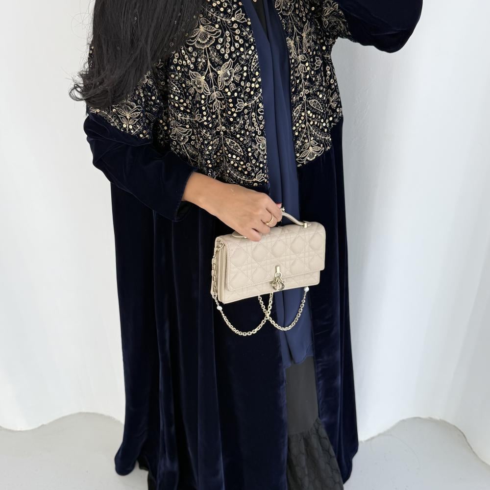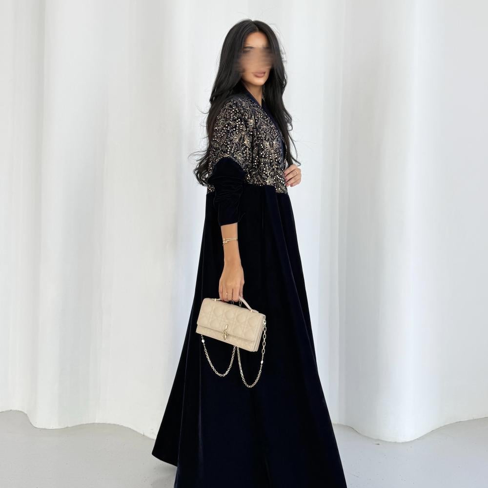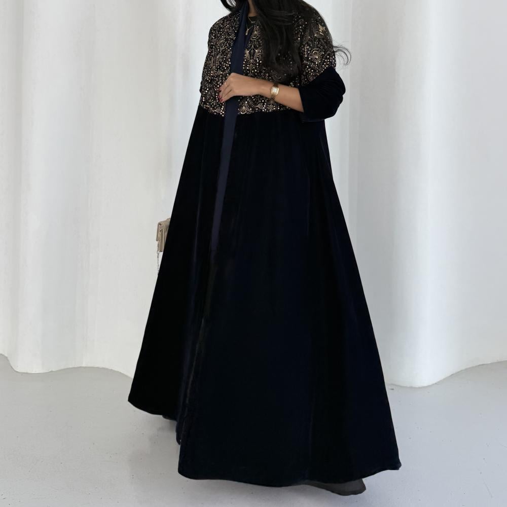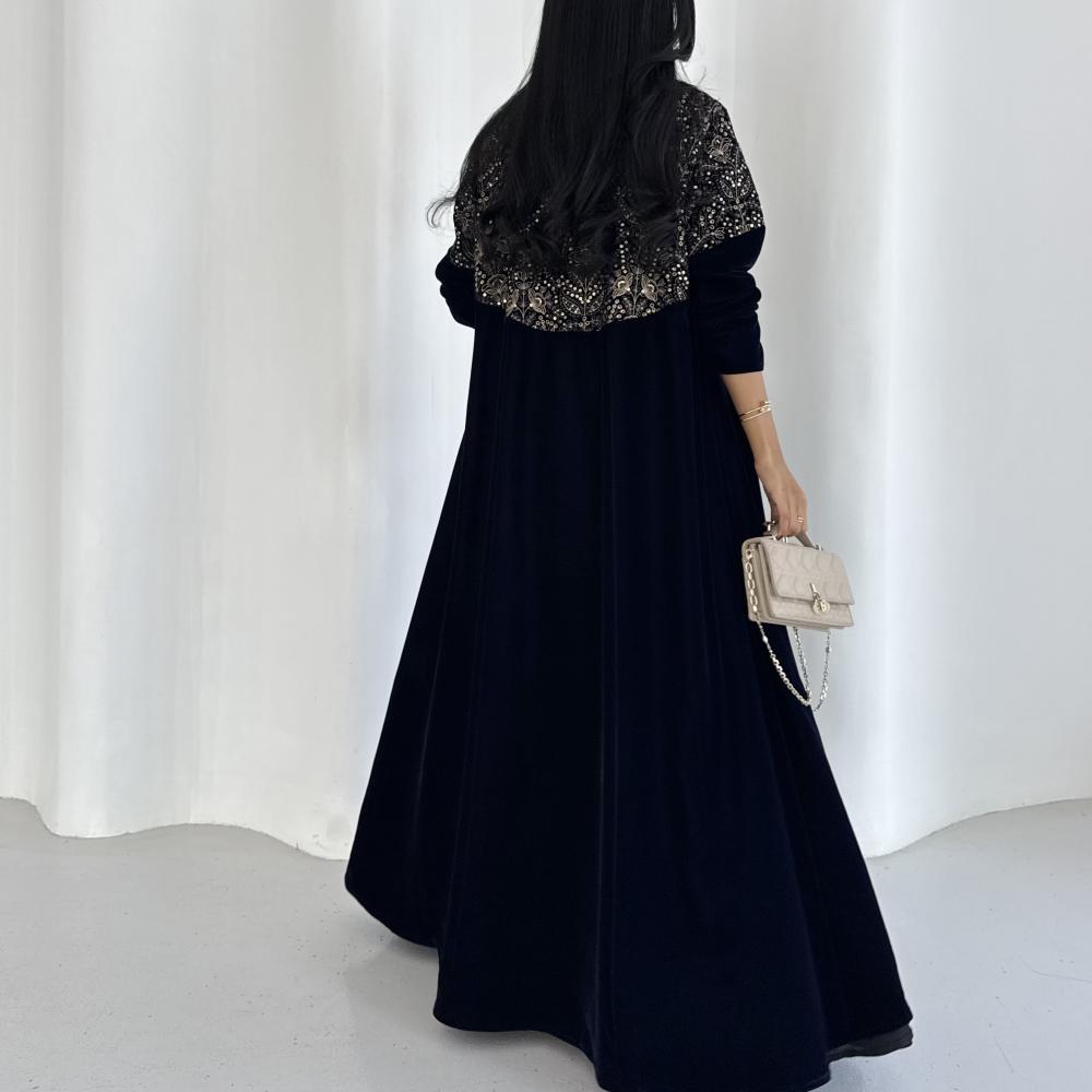 القماش: مخمل كحلي مطرز مع مخمل كحلي سادة مبطن بشيفون كحلي
