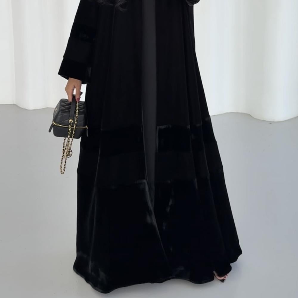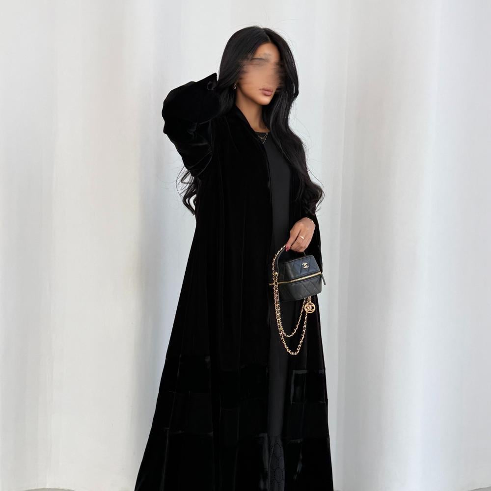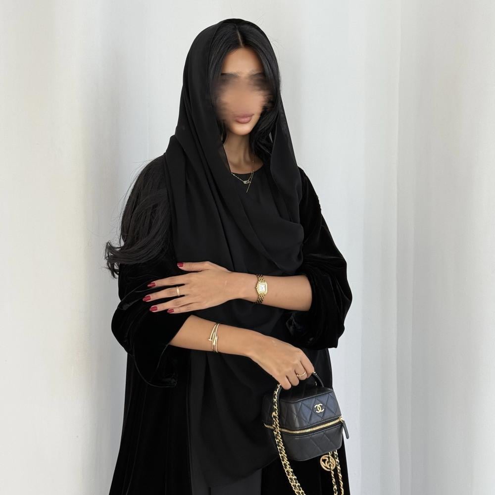 القماش: مخمل اسود مع مخمل حرير اسودالطرحة: اسودالقصة: نص كلوشطريقة الغسيل: غسيل جافدرجة التدفئة: خفيف
