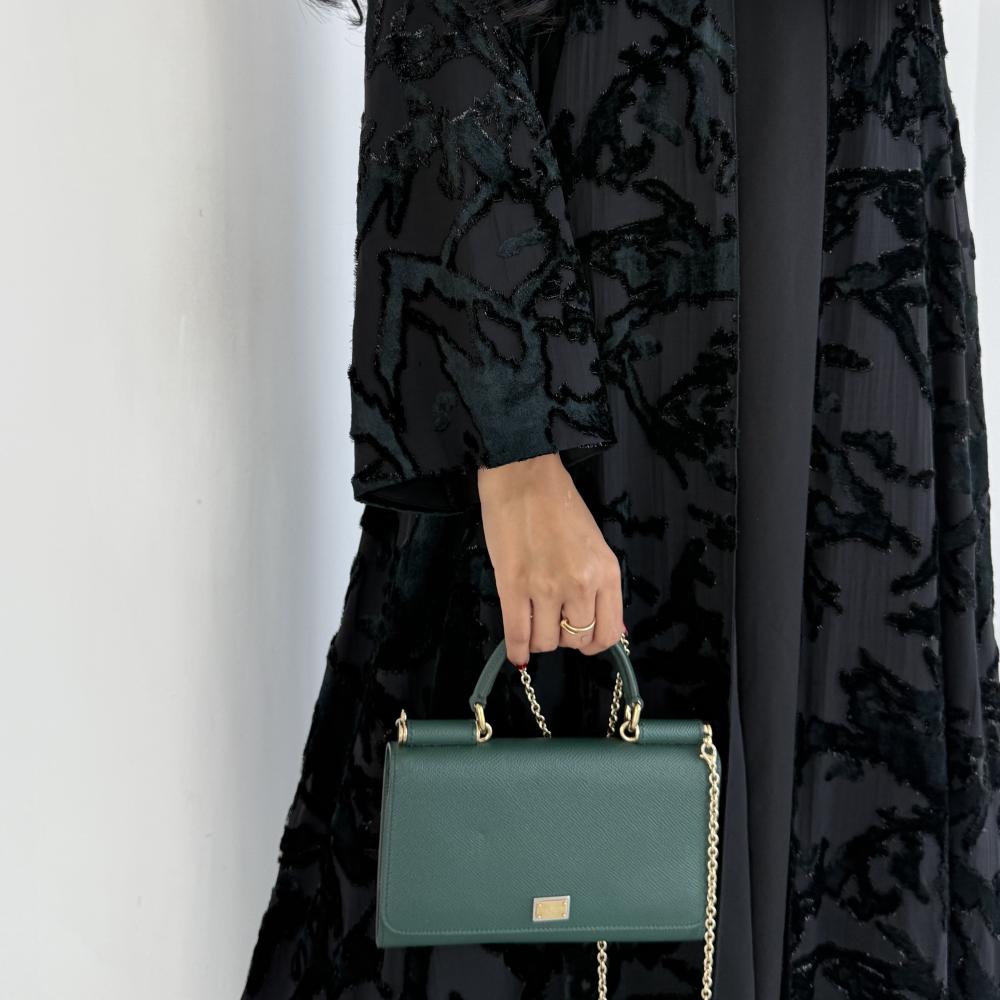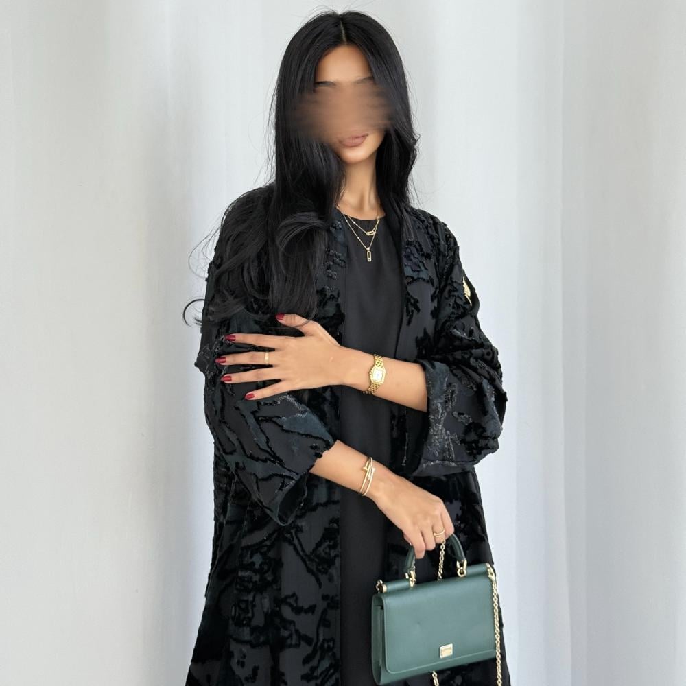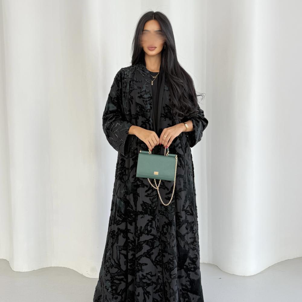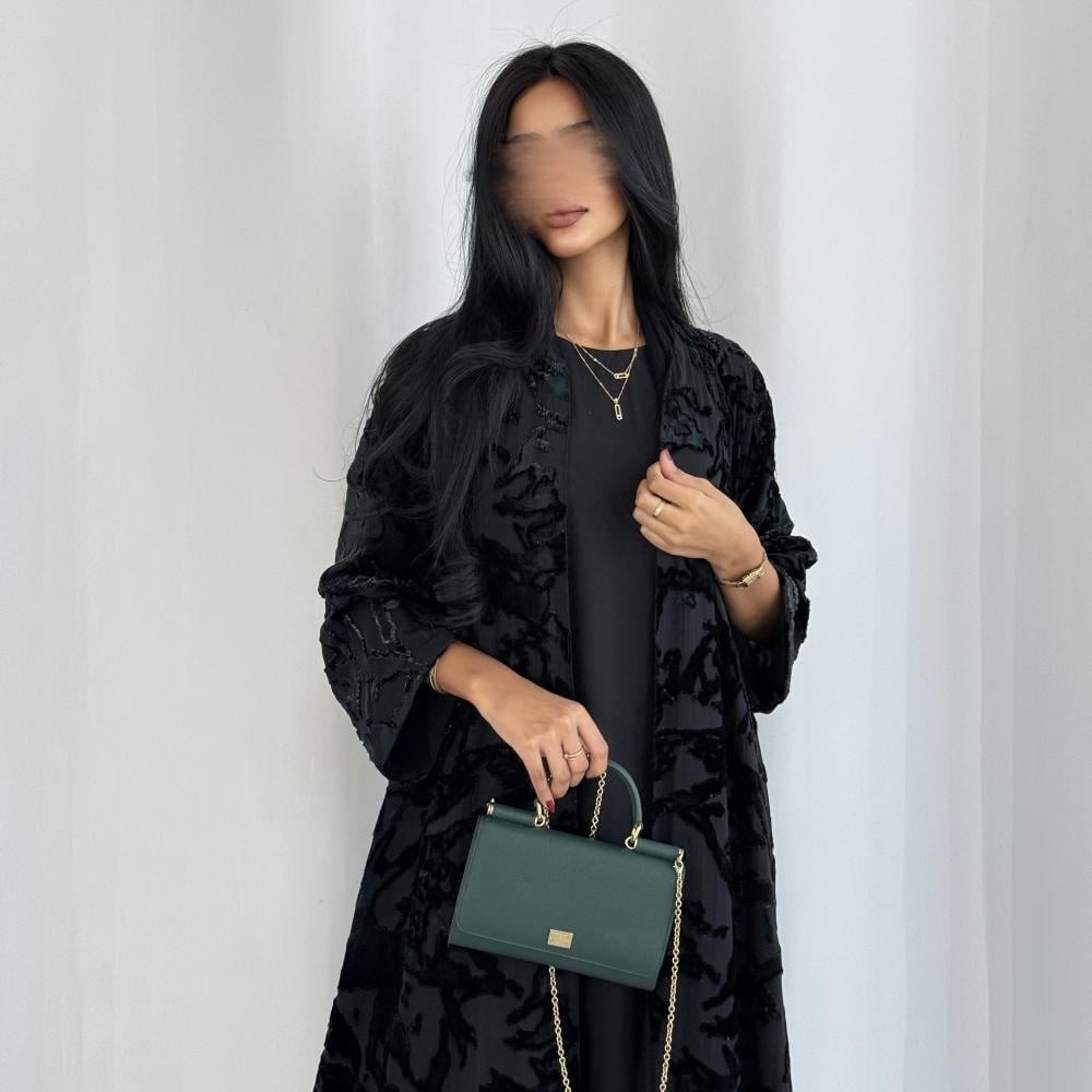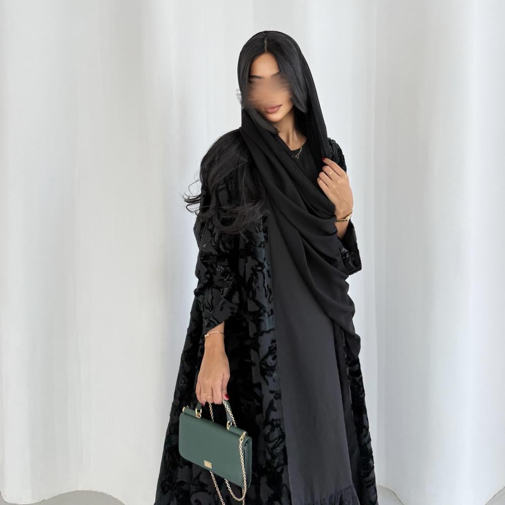 القماش: شيفون مخمل حرير زيتي بلمعة اسود مبطن بشيفون اسود