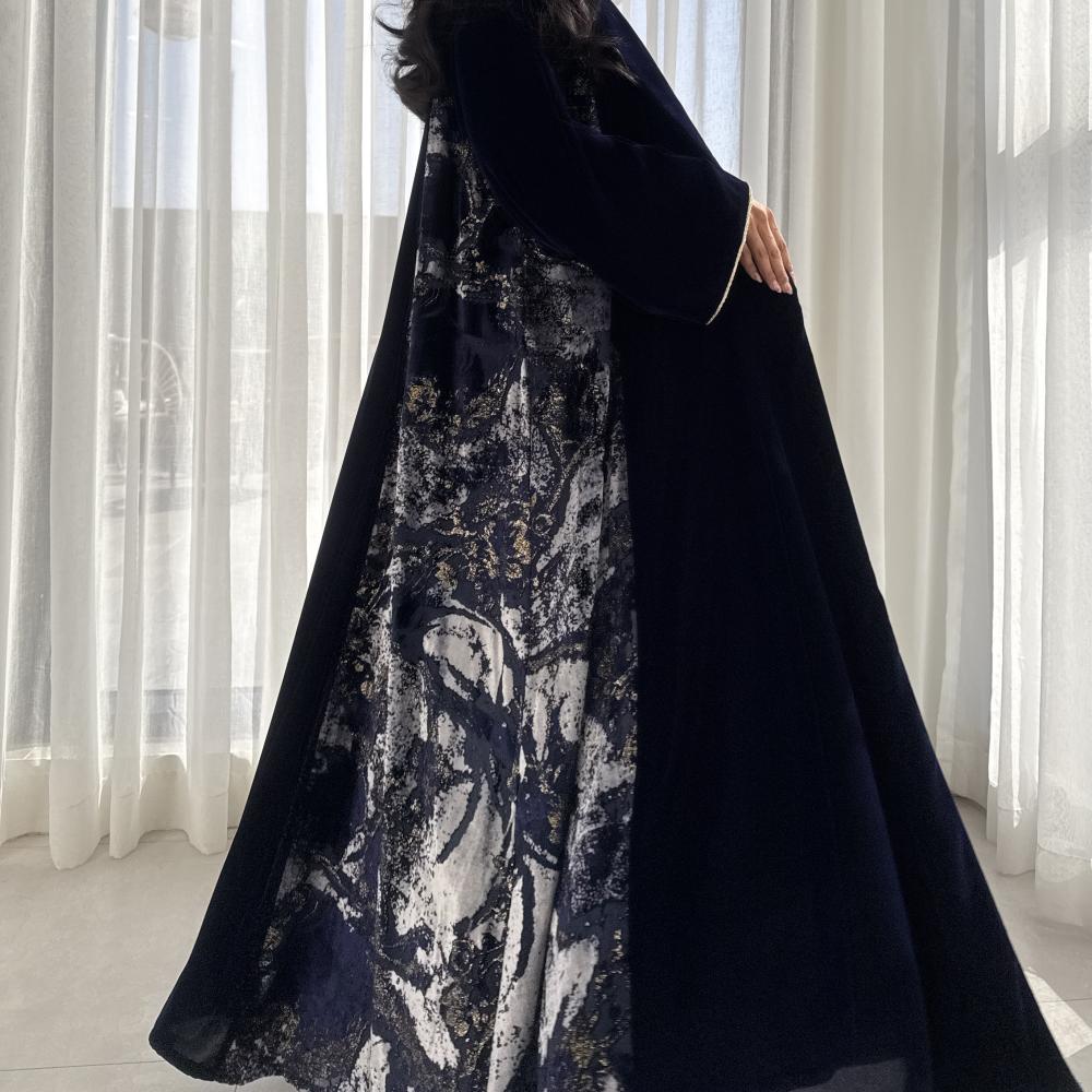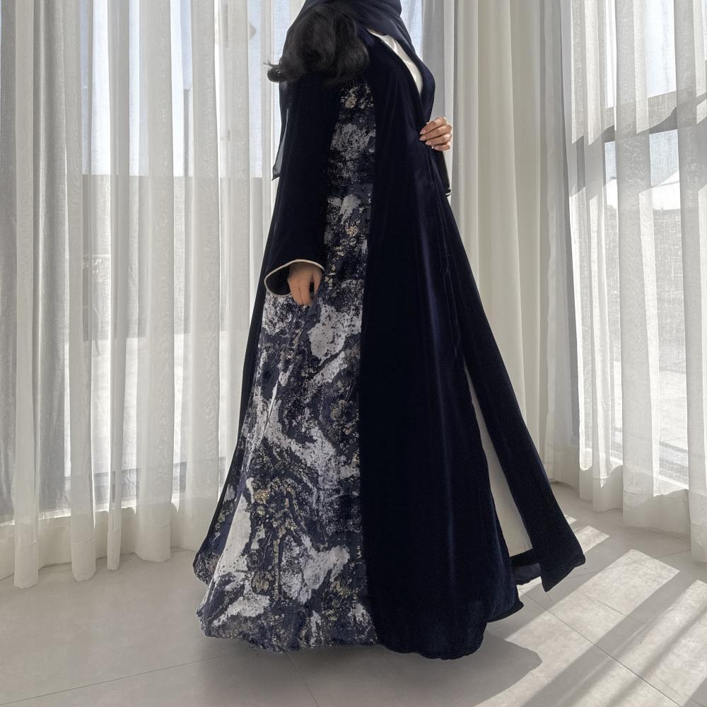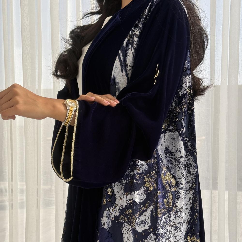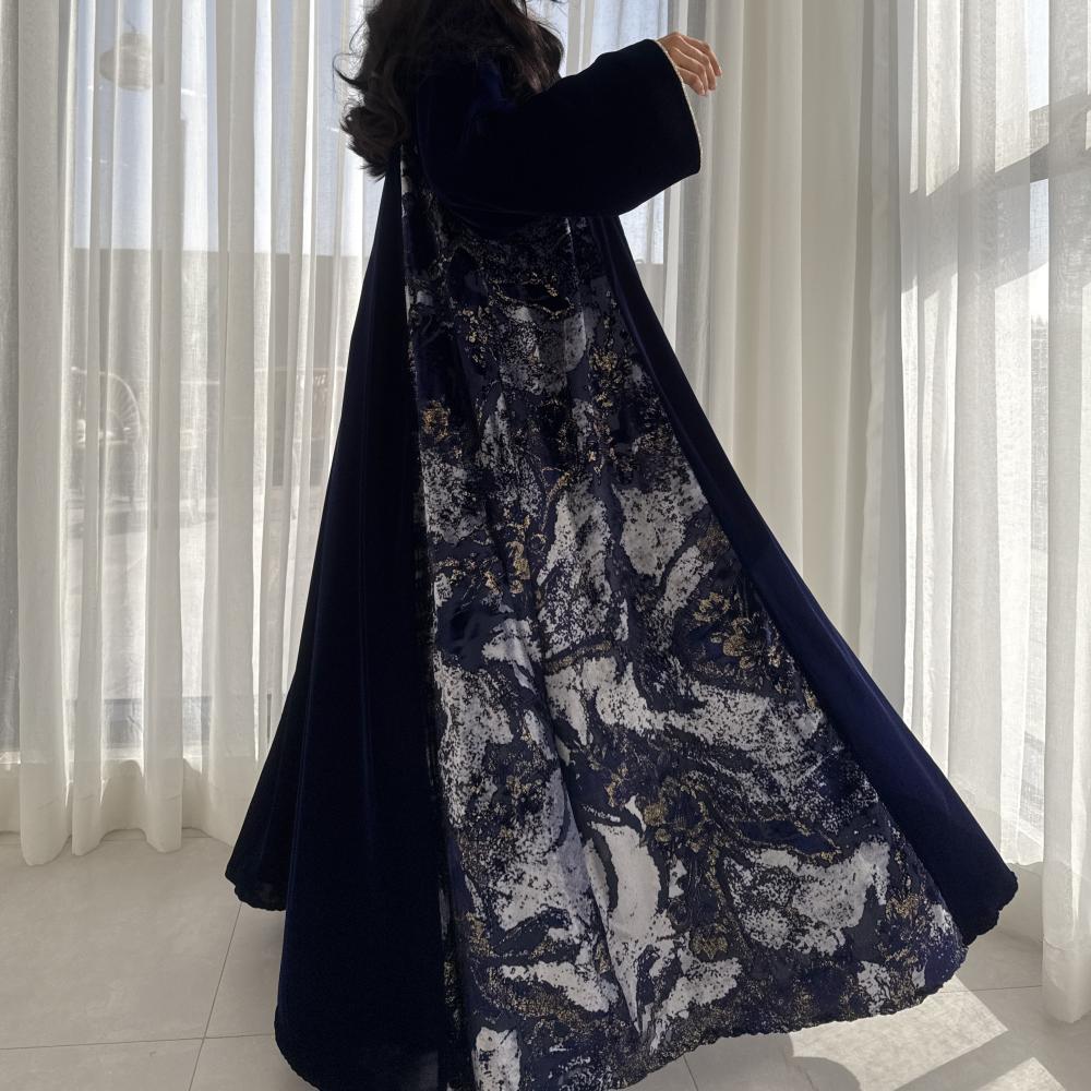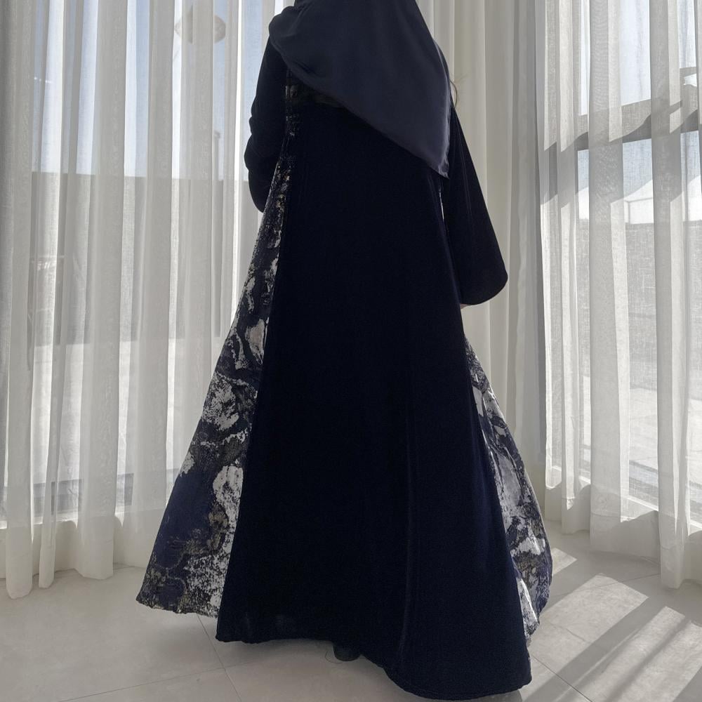 القماش: مخمل كحلي كوري مع شيفون مخمل كحلي برمادي ايطالي