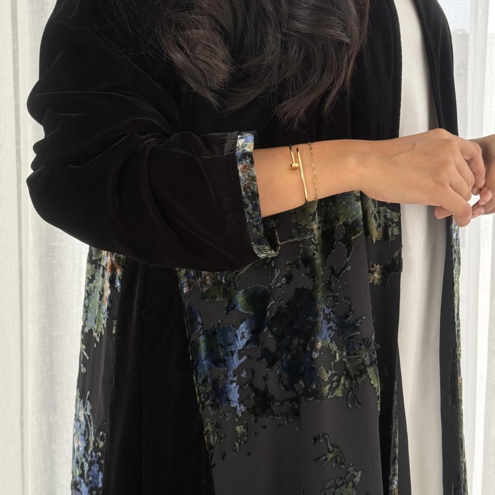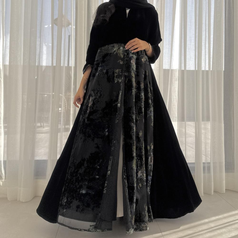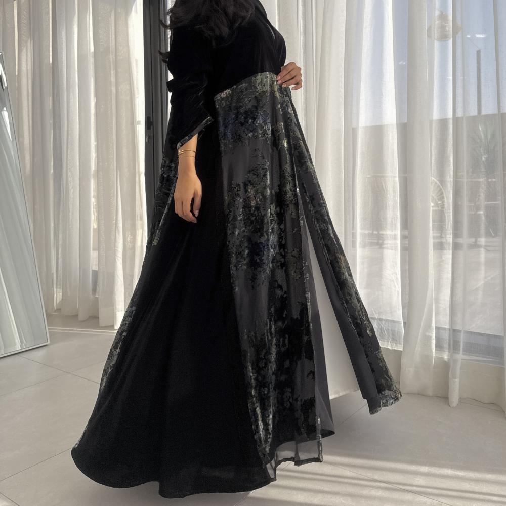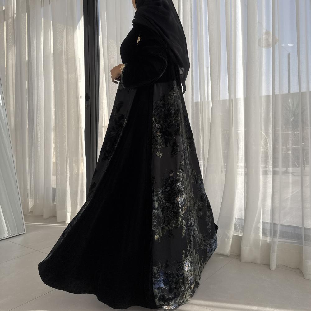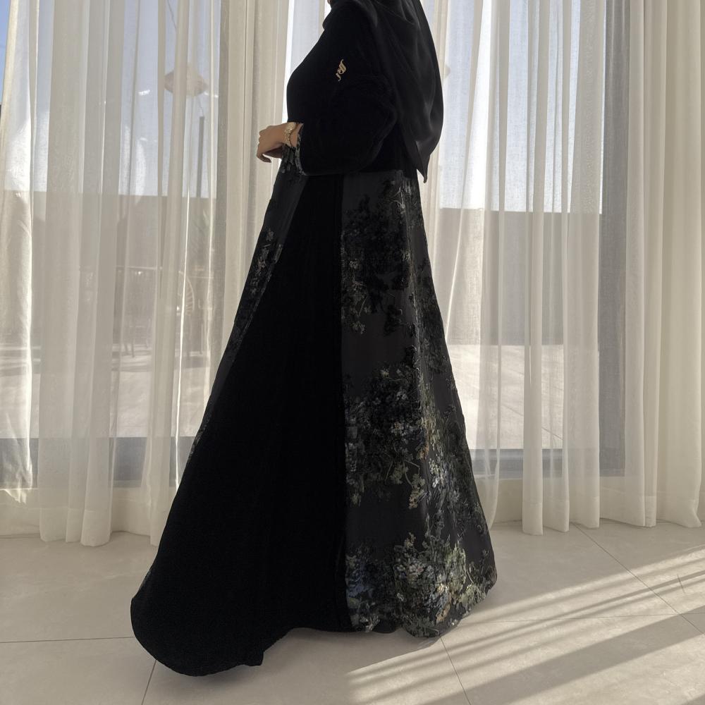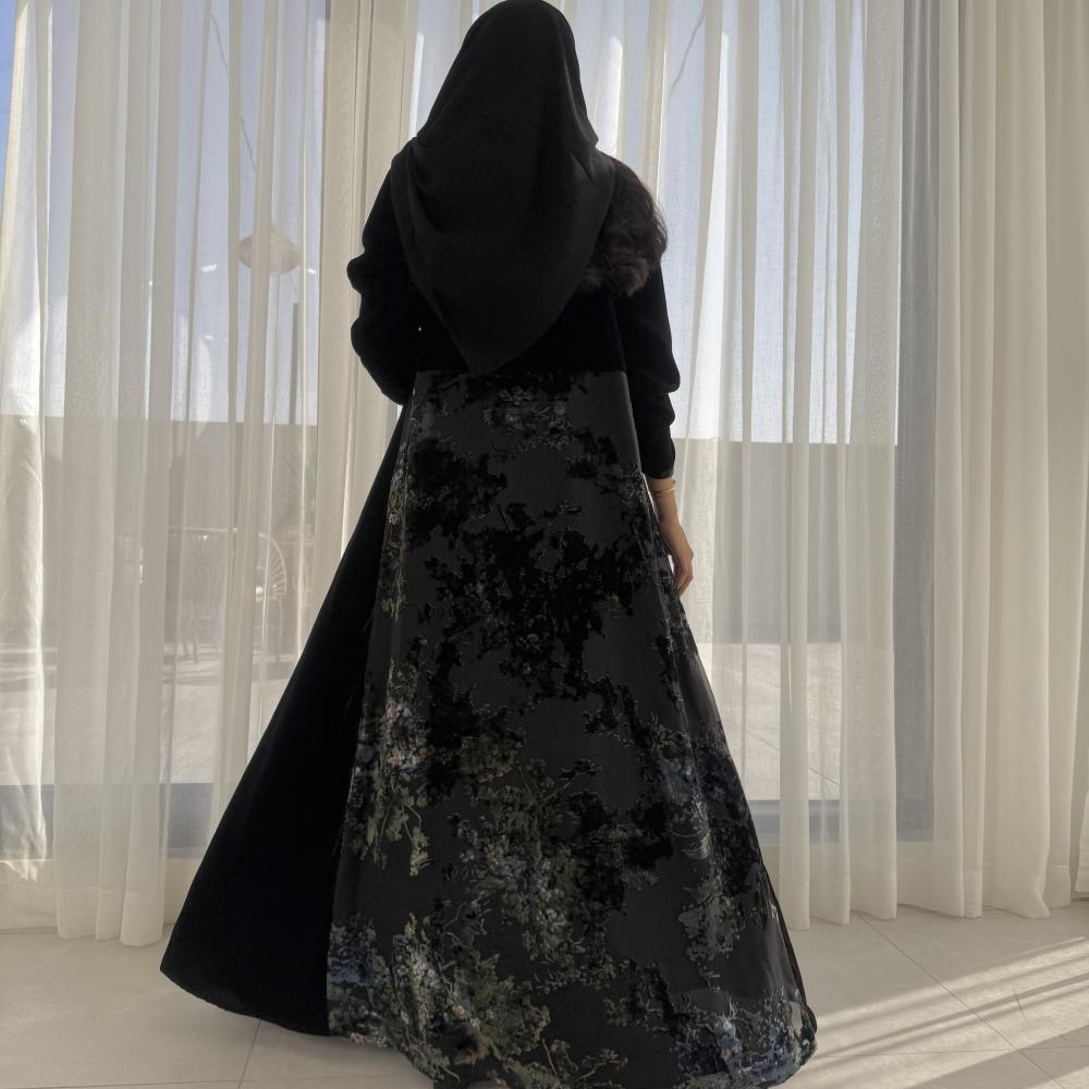 القماش: مخمل اسود مع مخمل مورد طاغي عليه اللون السماوي