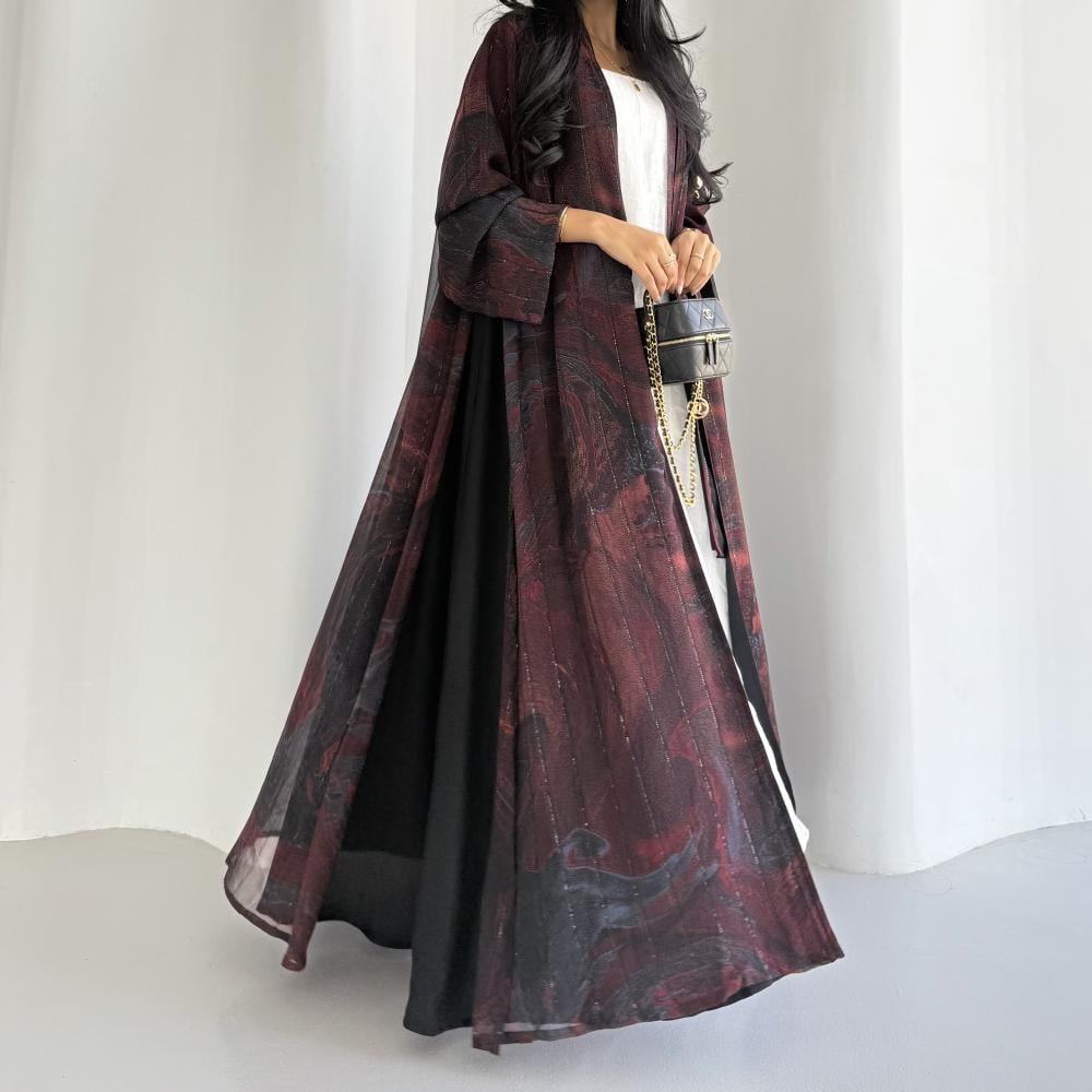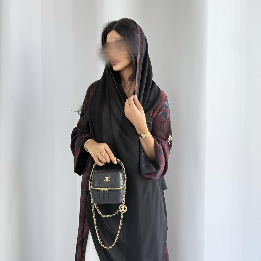 القماش: شيفون مموج غالب عليه اللون الاحمر مبطن بكريب "بلاك بيري" اسود