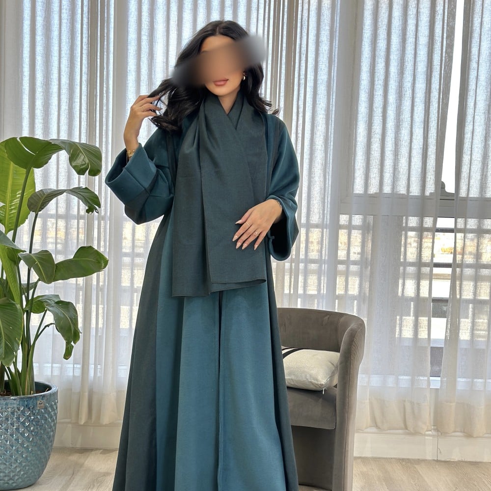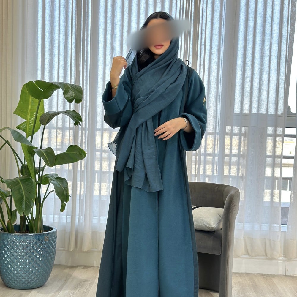 القماش: جوخ تركواز مع كشمير تركواز مع شال كشميرالطرحة: ليننالقصة: نص كلوشطريقة الغسيل: غسيل جافدرجة التدفئة: خفيف