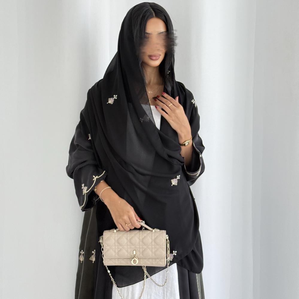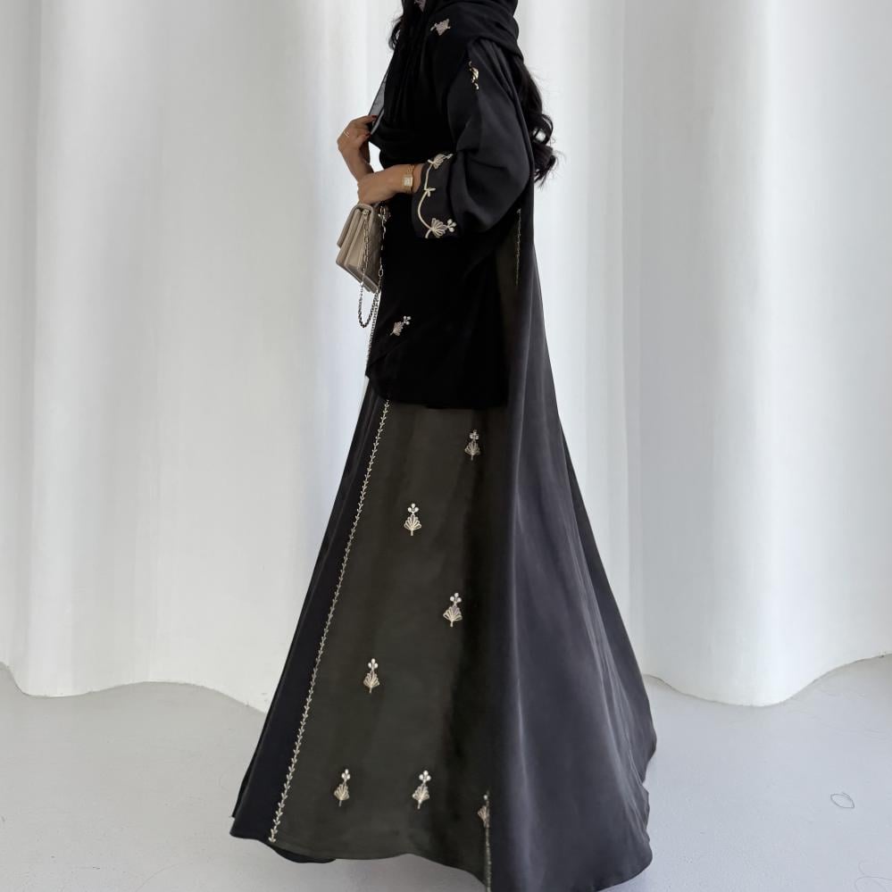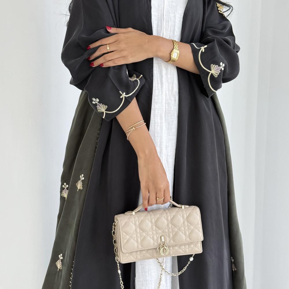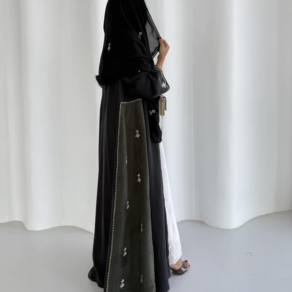 القماش: حرير مغسول ياباني أسود مع حرير مغسول ياباني زيتي غامق مطرز